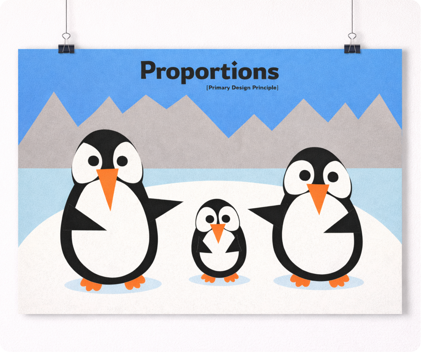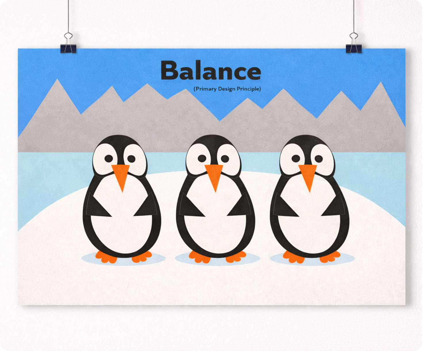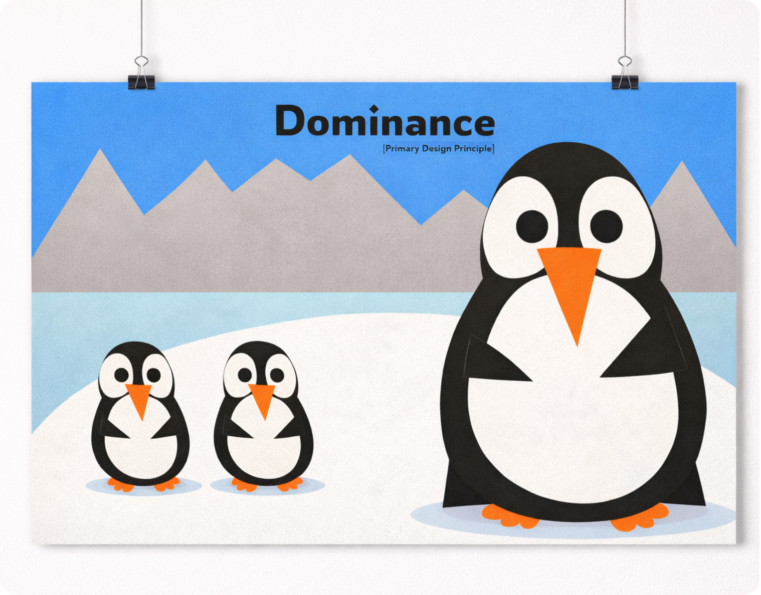 This poster series explores fundamental design principles through a cohesive cut-paper visual style. Using stylized penguin characters in a simplified arctic environment, each composition focuses on a specific concept—unity, balance, variety, hierarchy, proportions, and dominance.