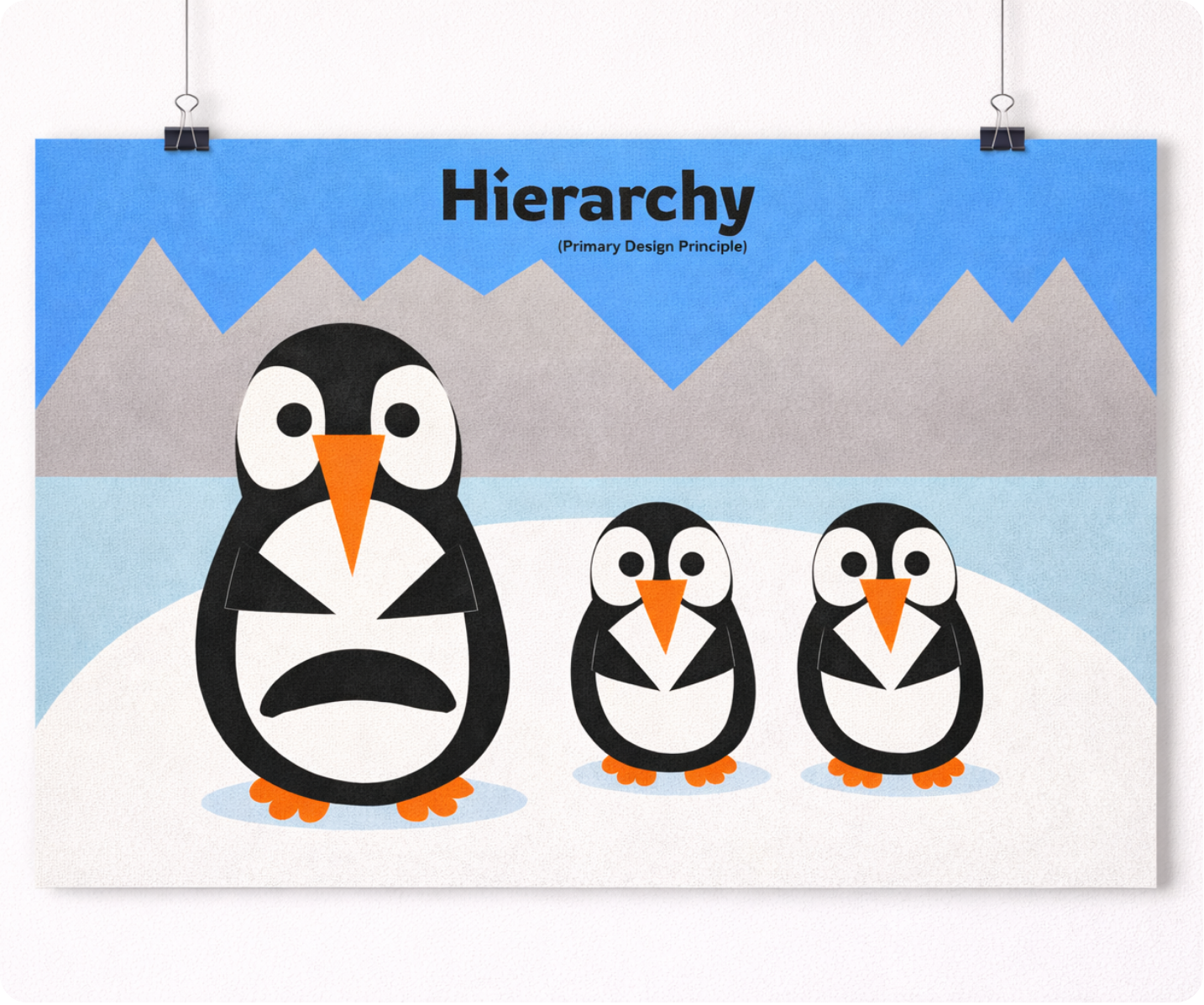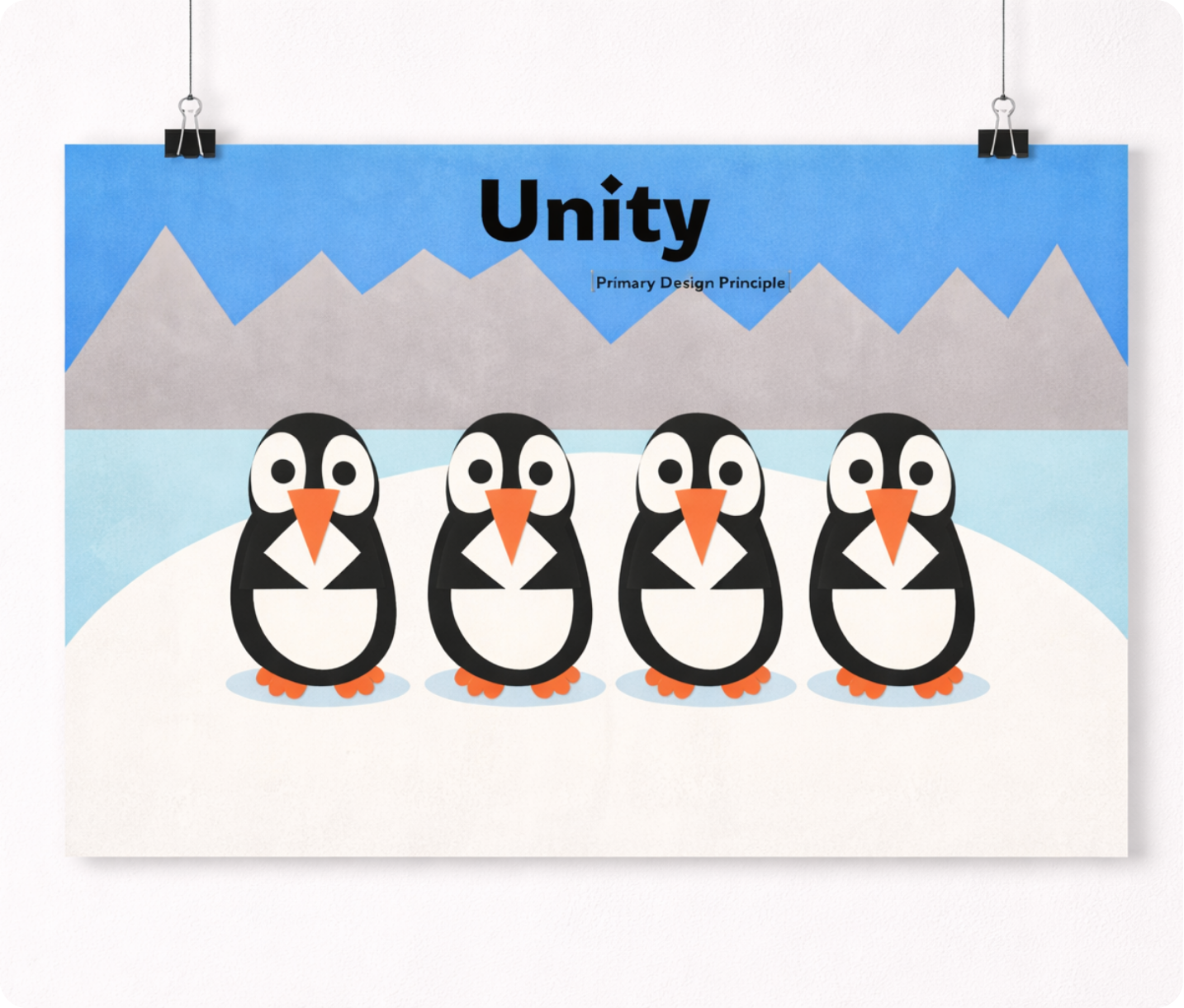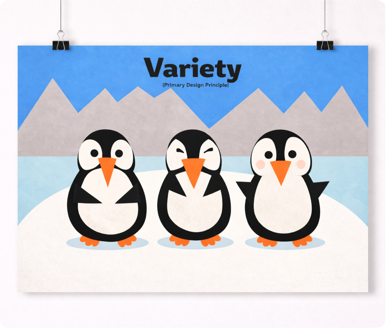 This poster series explores fundamental design principles through a cohesive cut-paper visual style. Using stylized penguin characters in a simplified arctic environment, each composition focuses on a specific concept—unity, balance, variety, hierarchy, proportions, and dominance.