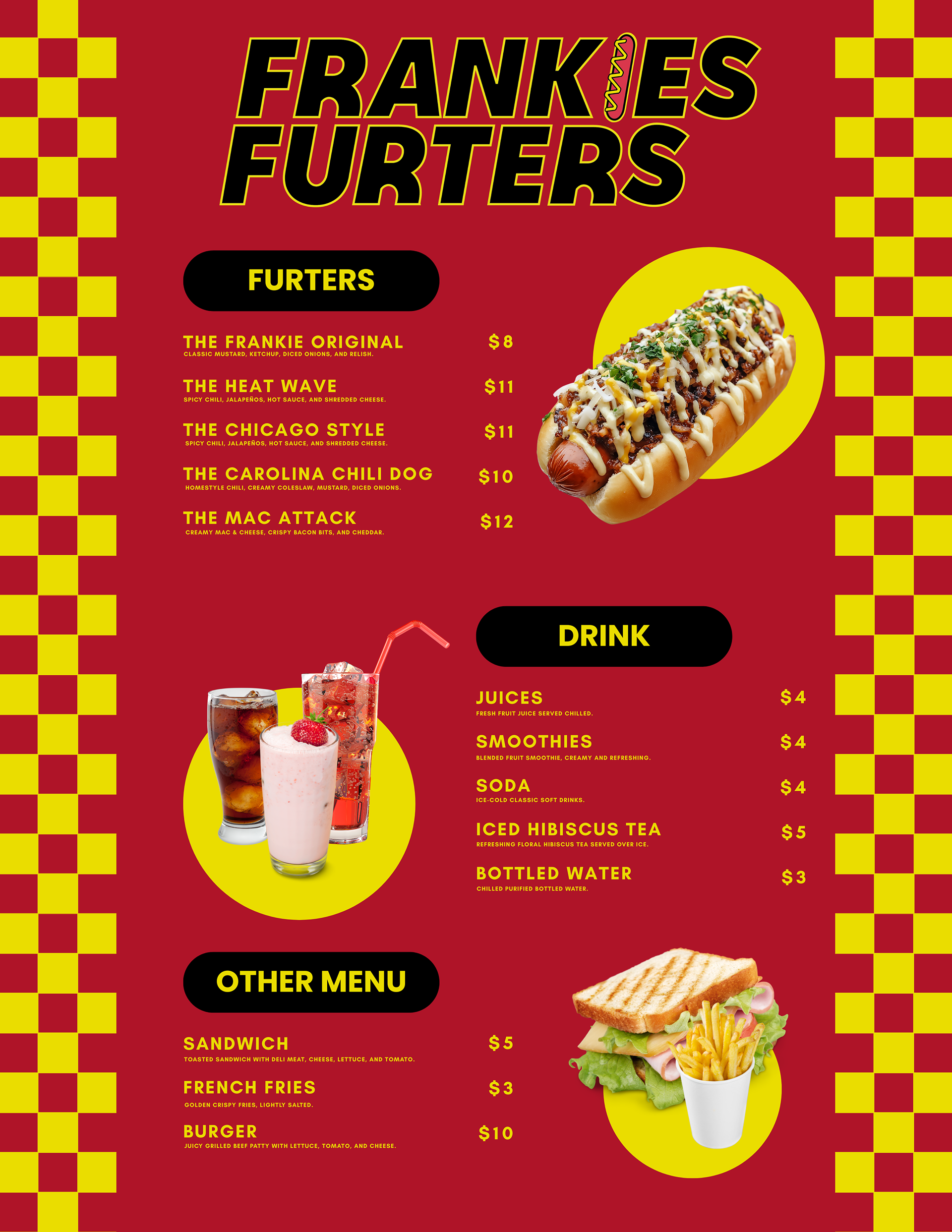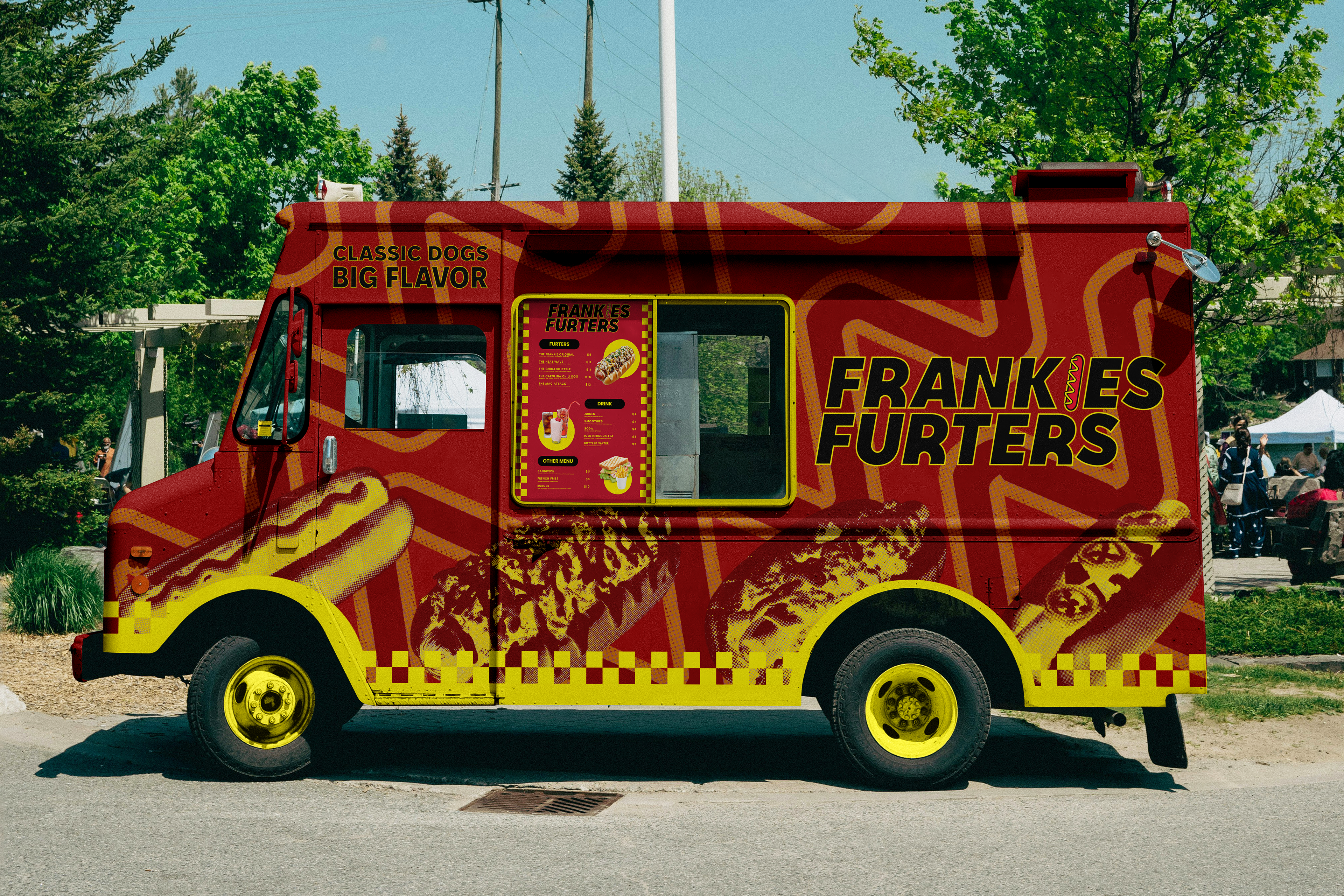 Frankie’s Furters is a bold street-food brand concept that blends nostalgic diner vibes with a modern, graphic-driven style. A vibrant red and yellow palette brings energy and personality across every touchpoint.